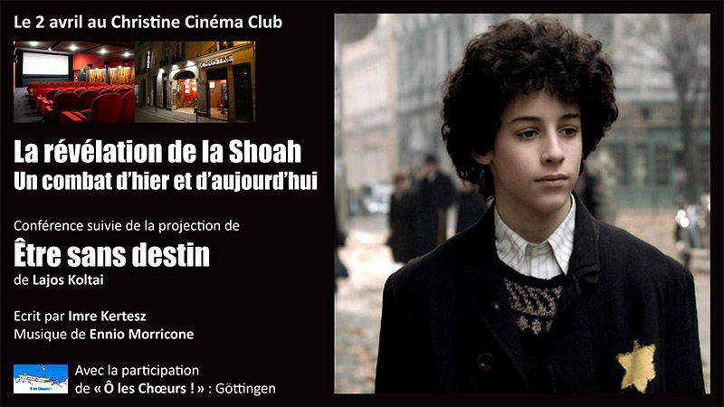 • 18 heures : Conférence avec Judith Cohen Solal, Claude Fischer Herzog et Yossef Murciano • 19h15 : intermède musical avec la chorale Ô les Chœurs ! • 20 heures – 22 heures : Projection de « Être sans destin » de Lajos Koltai, écrit par Imre Kertesz, sur la musique d’Ennio Morricone
